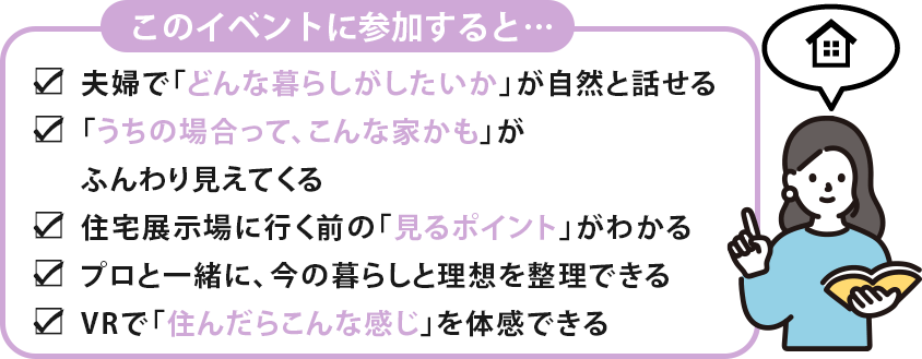- 住宅購⼊に関する考え⽅、知識の提供を⽬的とするイベントです。物件の営業などは⼀切ございませんので、お気軽にご参加ください。